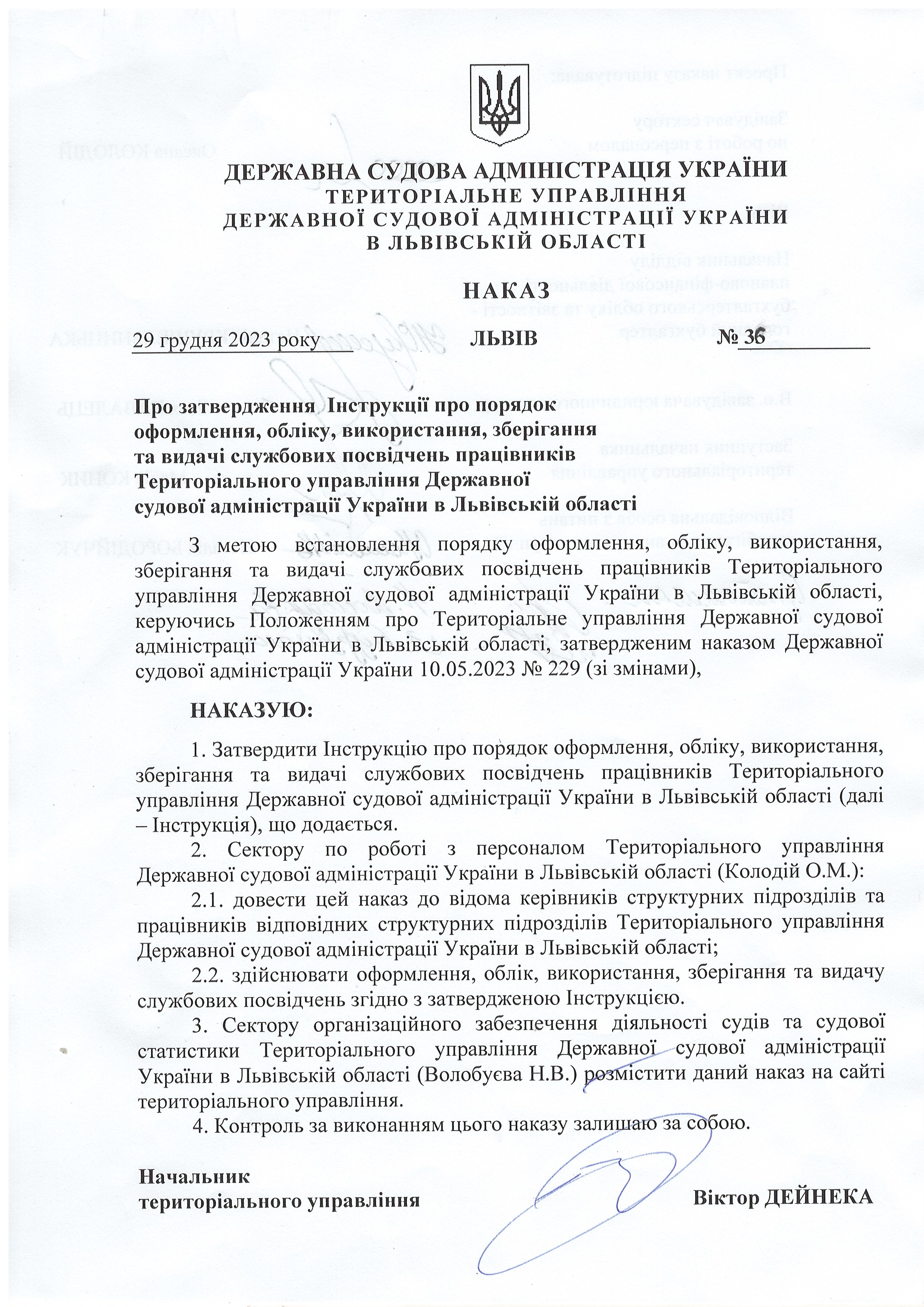Наказ №36 від 29.12.2023 Про затвердження Інструкції про порядок оформлення, обліку, використання, зберігання та видачі службових посвідчень працівників ТУ ДСА України в Львівській області