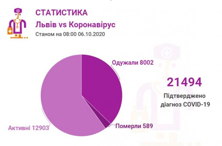 Станом на 06 жовтня у Львові та Львівській області загалом коронавірусну інфекцію виявлено— у 21494 осіб, 589 людей померли. 8002 пацієнти одужало.