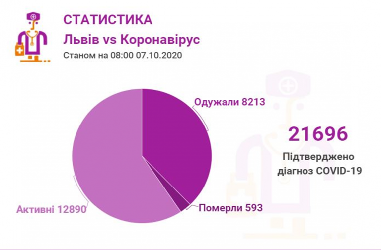 Станом на 07 жовтня у Львові та Львівській області загалом коронавірусну інфекцію виявлено— у 21696 осіб, 593 людини померли. 8213 пацієнтів одужало.