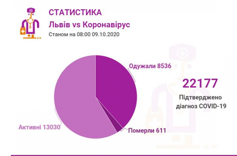 Станом на 09 жовтня у Львові та Львівській області загалом коронавірусну інфекцію виявлено— у 22177 осіб, 611 людей померли. 8536 пацієнтів одужало.