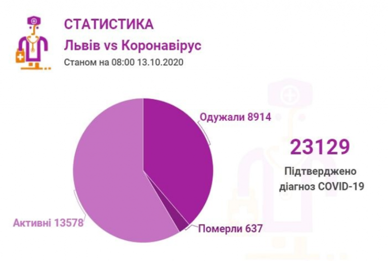 Станом на 13 жовтня у Львові та Львівській області загалом коронавірусну інфекцію виявлено — у 23129 осіб, 637 людей померли. 8914 пацієнтів одужало.
