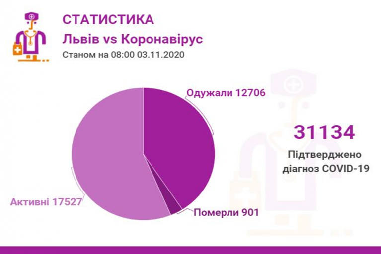 Станом на 03 листопада у Львові та Львівській області загалом коронавірусну інфекцію виявлено— у 31134 осіб, 901 людина померла. 12706 пацієнтів одужало.