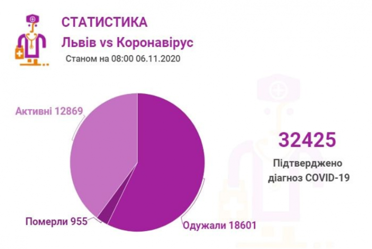 Станом на 06 листопада у Львові та Львівській області загалом коронавірусну інфекцію виявлено — у 32425 осіб, 955 людей померло. 18601 пацієнт одужав.