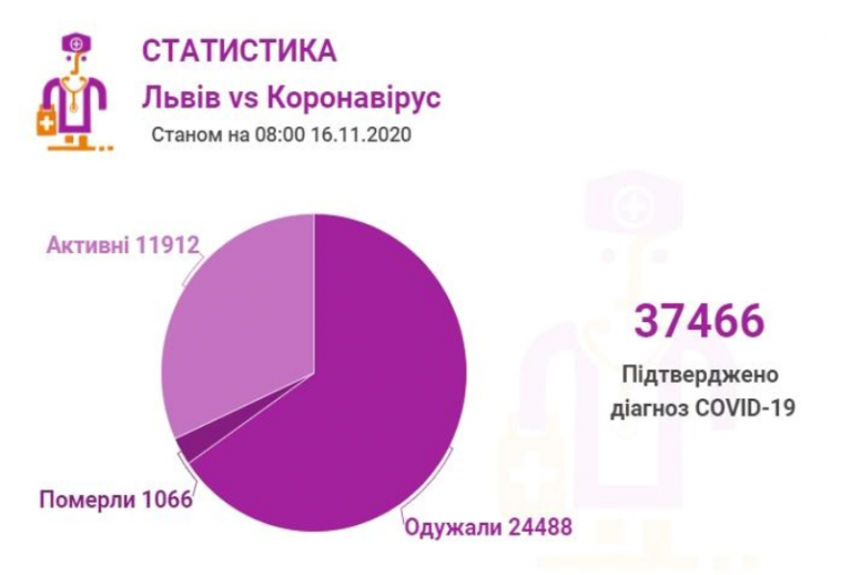 Станом на 16 листопада у Львові та Львівській області загалом коронавірусну інфекцію виявлено — у 37466 осіб, 1066 людей померло. 24488 пацієнтів одужало.