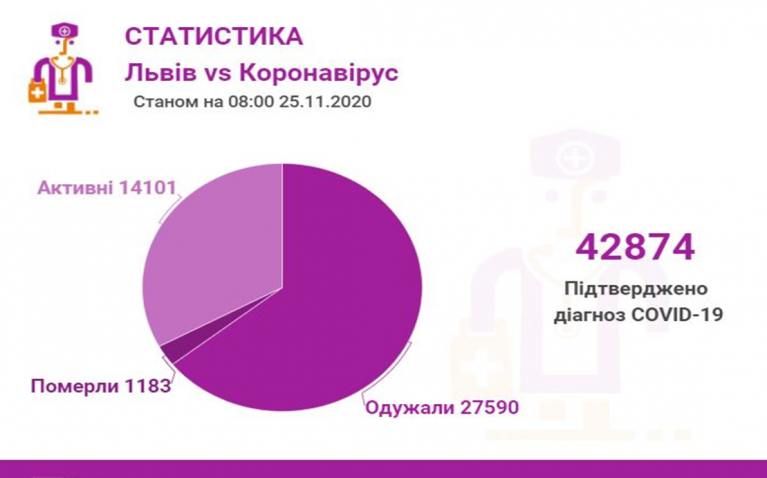 Станом на 25 листопада у Львові та Львівській області загалом коронавірусну інфекцію виявлен -у 42874 осіб (з них по місту Львову — 18196). З них 27590 — одужали (по місту Львову — 12449), 1183 — померли (з них по місту Львову — 562).
