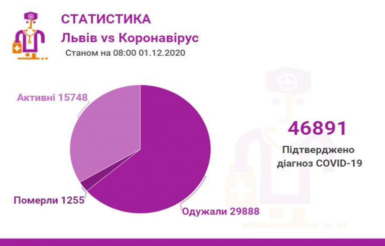 Станом на 01 грудня у Львові та Львівській області загалом коронавірусну інфекцію виявлено— у 46891 особа, 1255 людей померло. 2988 пацієнтів одужало. По місту за цей період Covid-19 підтвердили у 20180 осіб, з яких 13348 вже одужало, а 602 людини померли.
