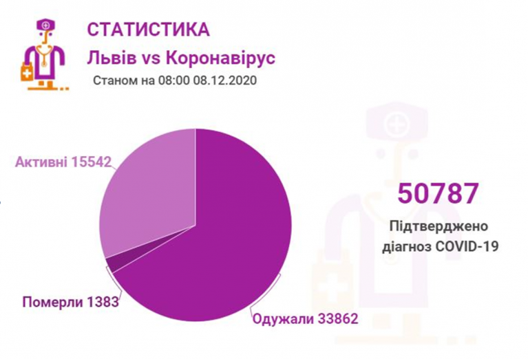 Станом на 08 грудня у Львові та Львівській області загалом коронавірусну інфекцію виявлено — у 50787 осіб, 1383 людини померли. 33862 пацієнти одужало. По місту за цей період Covid-19 підтвердили у 22470 осіб, з яких 14936 вже одужало і летальних випадків — 650.