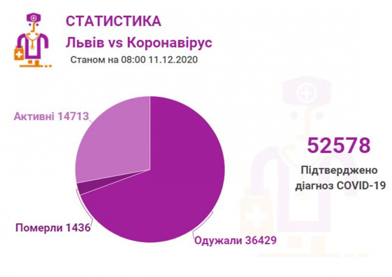 Станом на 11 грудня у Львові та Львівській області загалом коронавірусну інфекцію виявлено— у 52578 осіб (з них у Львові - 23462), 1436 людей померли (з них у Львові - 675). 36429 пацієнтів одужало (з них у Львові - 15808).