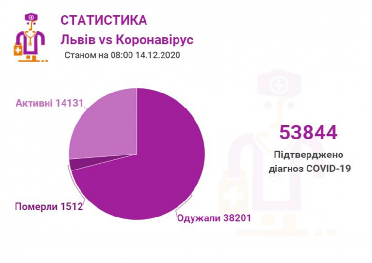 Станом на 14 грудня у Львові та Львівській області загалом коронавірусну інфекцію виявлено— у 53844 осіб (з них у Львові - 24050), 1512 людей померли (з них у Львові - 687). 38201 пацієнт одужав (з них у Львові - 16724).