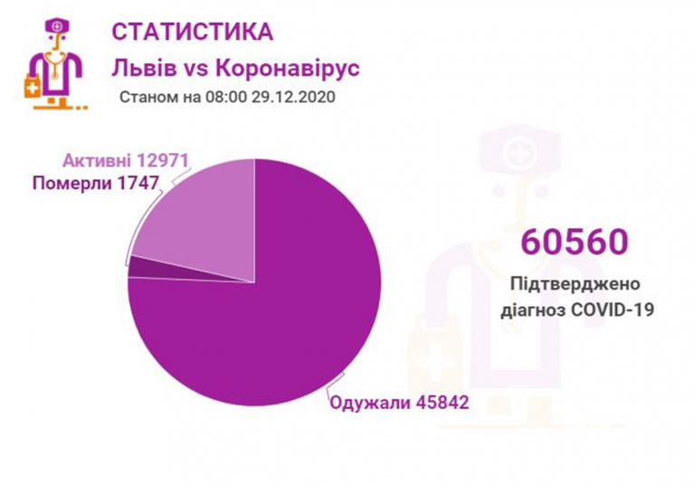 Станом на 29 грудня у Львові та Львівській області загалом коронавірусну інфекцію виявлено— у 60560 осіб, 1747 людей померло. 45842 пацієнти одужало. По місту за цей період Covid-19 підтвердили у 27934 осіб, з яких 20607 вже одужало і летальних випадків — 778.