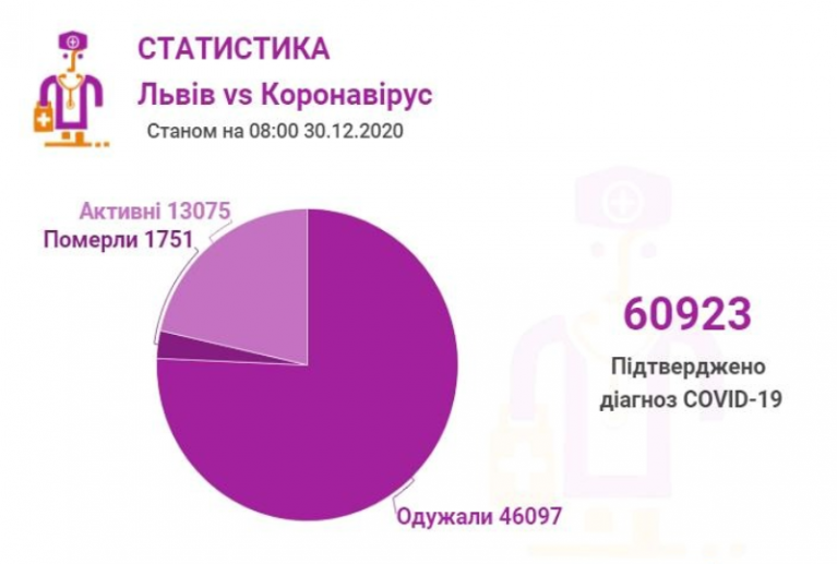 Станом на 30 грудня у Львові та Львівській області загалом коронавірусну інфекцію виявлено — у 60923 осіб, 1751 людина померла. 46097 пацієнтів одужало. По місту за цей період Covid-19 підтвердили у 28253 осіб, з яких 20985 вже одужало і летальних випадків — 784.