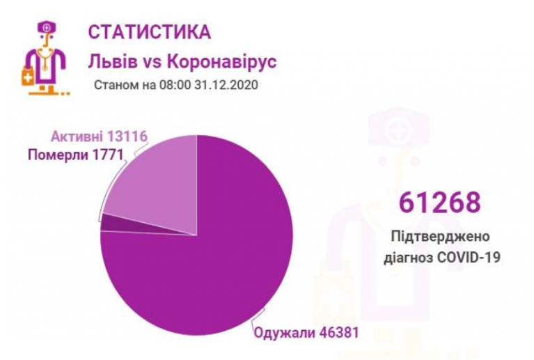 Станом на 31 грудня у Львові та Львівській області загалом коронавірусну інфекцію виявлено — у 61268 осіб, 1771 людина померла. 46381 пацієнт одужав. По місту за цей період Covid-19 підтвердили у 28470 осіб, з яких 21890 вже одужало і летальних випадків — 787.