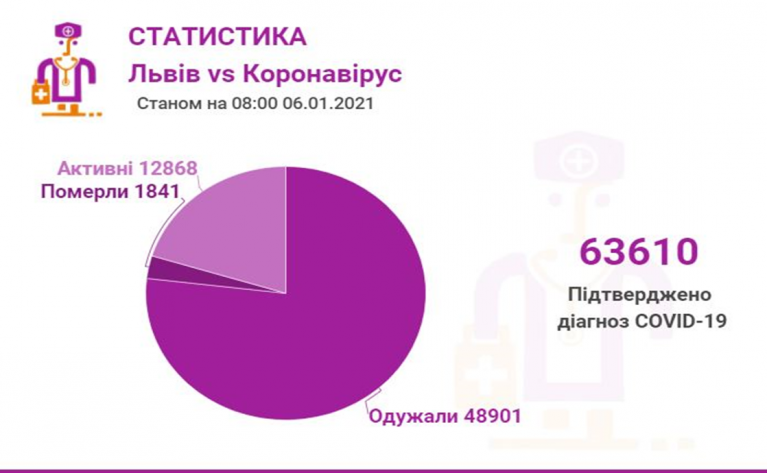 Станом на 06 січня у Львові та Львівській області загалом коронавірусну інфекцію виявлено—у 63610 осіб, 1841 людина померла. 48901 пацієнт одужав. По місту за цей період Covid-19 підтвердили у 29884 осіб, з яких 23127 вже одужало і летальних випадків — 820.