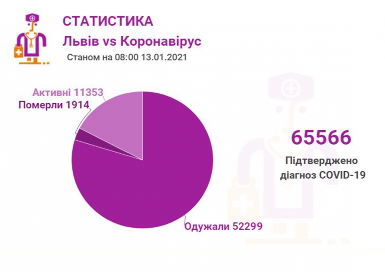 Станом на 13 січня у Львові та Львівській області загалом коронавірусну інфекцію виявлено- у 65566 осіб, 1914 людей померло. 52299 пацієнтів одужав. По місту за цей період Covid-19 підтвердили у 31000 осіб, з яких 24993 вже одужало і летальних випадків — 860.