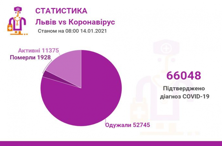 Станом на 14 січня у Львові та Львівській області загалом коронавірусну інфекцію виявлено-у 66048 осіб, 1928 людей померло. 52745 пацієнтів одужало. По місту за цей період Covid-19 підтвердили у 31302 осіб, з яких 25165 вже одужало і летальних випадків — 867.