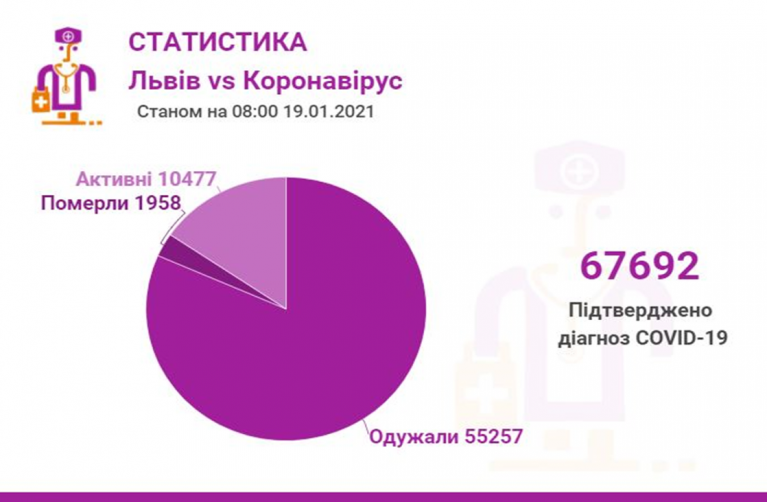 Станом на 19 січня у Львові та Львівській області загалом коронавірусну інфекцію виявлено у 67692 осіб, 1958 людей померло. 55257 пацієнтів одужало. По місту за цей період Covid-19 підтвердили у 32222 осіб, з яких 26475 вже одужало і летальних випадків — 890.