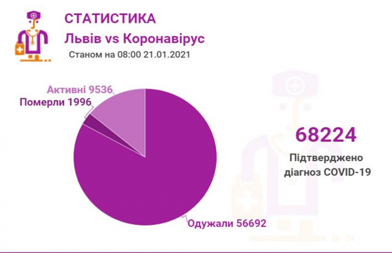 Станом на 21 січня у Львові та Львівській області загалом коронавірусну інфекцію виявлено у 68224 осіб, 1996 людей померло. 56692 пацієнти одужали. По місту за цей період Covid-19 підтвердили у 32546 осіб, з яких 27167 вже одужало і летальних випадків — 906.