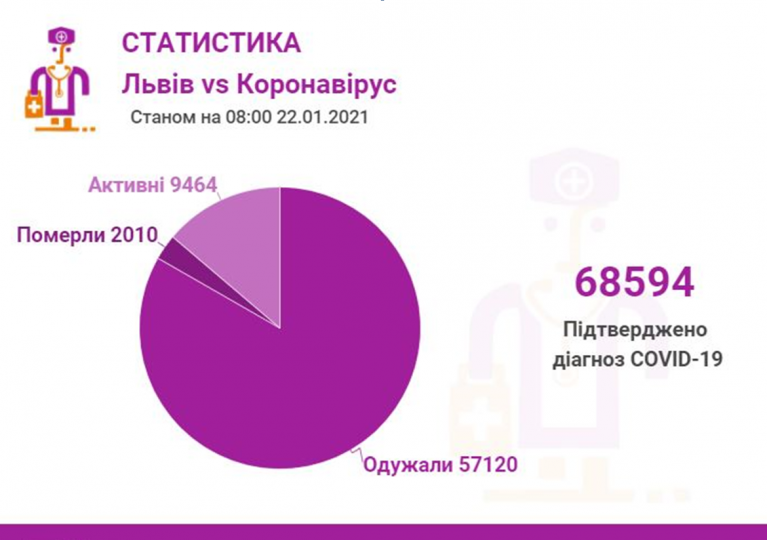 Станом на 22 січня у Львові та Львівській області загалом коронавірусну інфекцію виявлено у 68594 осіб, 2010 людей померло. 57120 пацієнтів одужало. По місту за цей період Covid-19 підтвердили у 32779 осіб, з яких 27646 вже одужало і летальних випадків — 912.