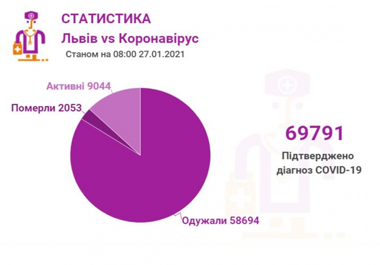 Станом на 27 січня у Львові та Львівській області загалом коронавірусну інфекцію виявлено у 69791 особи, 2053 людини померло. 58694 пацієнти одужало. По місту за цей період Covid-19 підтвердили у 33365 осіб, з яких 28714 вже одужало і летальних випадків — 931.