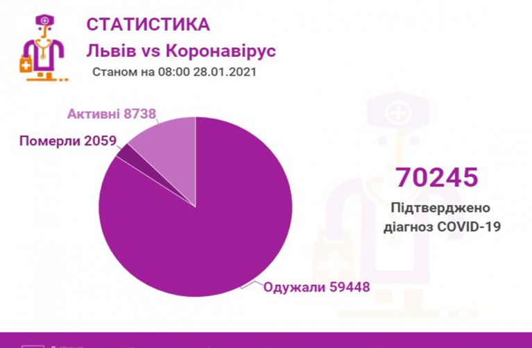 Станом на 28 січня у Львові та Львівській області загалом коронавірусну інфекцію виявлено у 70245 осіб, 2059 людей померло. 59448 пацієнти одужало. По місту за цей період Covid-19 підтвердили у 33602 осіб, з яких 28983 вже одужало і летальних випадків — 937.