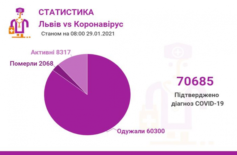 Станом на 29 січня у Львові та Львівській області загалом коронавірусну інфекцію виявлено у 70685 осіб, 2068 людей померло. 60300 пацієнтів одужало. По місту за цей період Covid-19 підтвердили у 33829 осіб, з яких 29112 вже одужало і летальних випадків — 940.