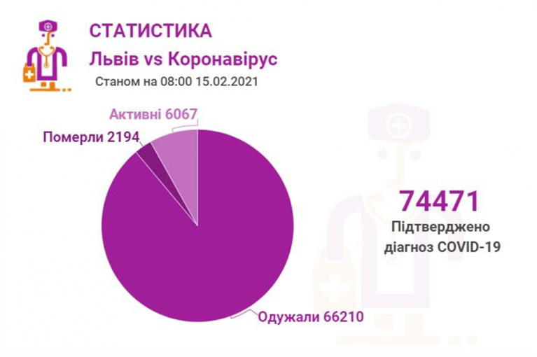 Станом на 15 лютого у Львові та Львівській області загалом коронавірусну інфекцію виявлено у 74471 особи, 2194 людини померло. 66210 пацієнтів одужало. По місту за цей період Covid-19 підтвердили у 35603 осіб, з яких 31798 вже одужало і летальних випадків — 1003.