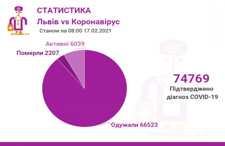 Станом на 17 лютого у Львові та Львівській області загалом коронавірусну інфекцію виявлено у 74769 осіб, 2207 людей померло. 66523 пацієнти одужало. По місту за цей період Covid-19 підтвердили у 35750 осіб, з яких 32464 вже одужало і летальних випадків — 1007.
