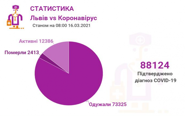 Станом на 16 березня у Львові та Львівській області загалом коронавірусну інфекцію виявлено у 88124 осіб, 2413 людей померло. 73325 пацієнтів одужало. По місту за цей період Covid-19 підтвердили у 42602 осіб, з яких 35627 вже одужало і летальних випадків — 1109.