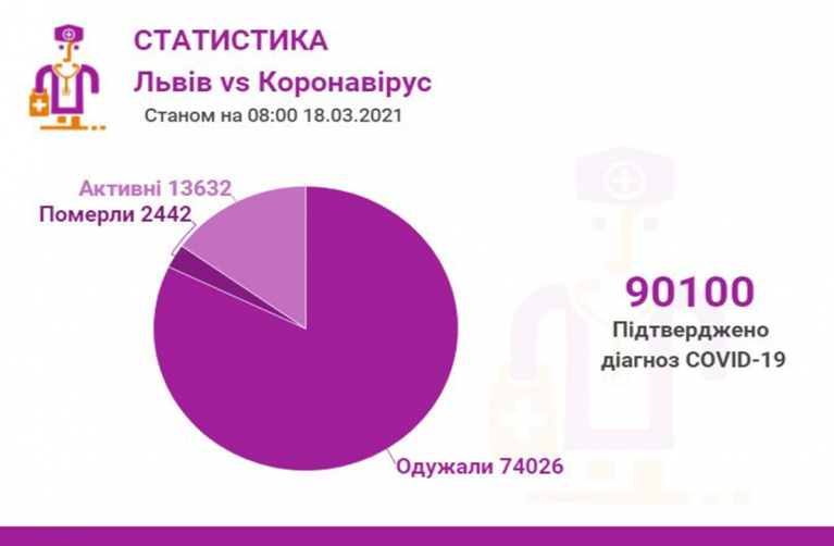 Станом на 18 березня у Львові та Львівській області загалом коронавірусну інфекцію виявлено у 90100 осіб, 2442 людини померло. 74026 пацієнтів одужало. По місту Covid-19 підтвердили у 43625 осіб, з яких 35996 вже одужало і летальних випадків — 1128.