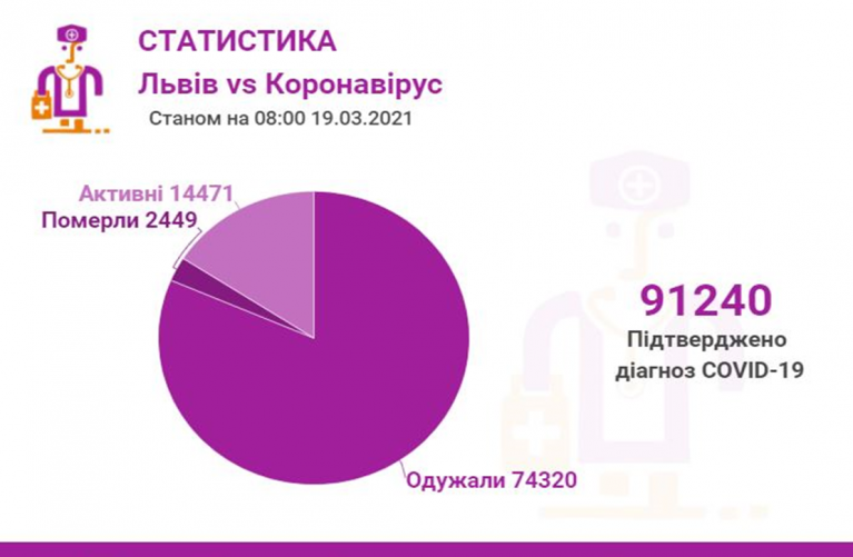 Станом на 19 березня у Львові та Львівській області загалом коронавірусну інфекцію виявлено у 91240 осіб, 2449 людей померло. 74320 пацієнтів одужало. По місту Covid-19 підтвердили у 44109 осіб, з яких 36188 вже одужало і летальних випадків — 1134.