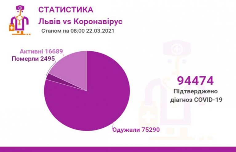 Станом на 22 березня у Львові та Львівській області загалом коронавірусну інфекцію виявлено у 94474 осіб, 2495 людей померло. 75290 пацієнтів одужало. По місту Covid-19 підтвердили у 45968 осіб, з яких 36780 вже одужало і летальних випадків — 1156.