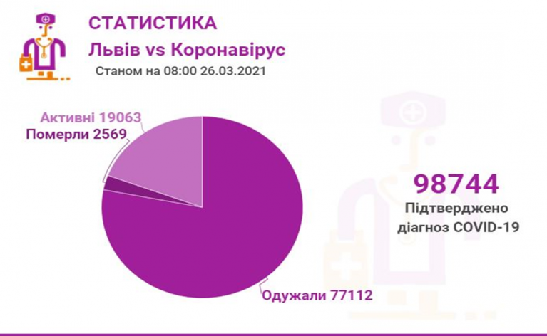 Станом на 26 березня у Львові та Львівській області загалом коронавірусну інфекцію виявлено у 98744 осіб, 2569 людей померло. 77112 пацієнтів одужало. По місту Covid-19 підтвердили у 48393 осіб, з яких 38096 вже одужало і летальних випадків — 1198.