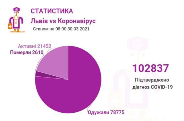 Станом на 30 березня у Львові та Львівській області зареєстровано 102837 підтверджених випадків захворювання на COVID-19, за останню добу — 961 випадок, з них у Львові - 502.