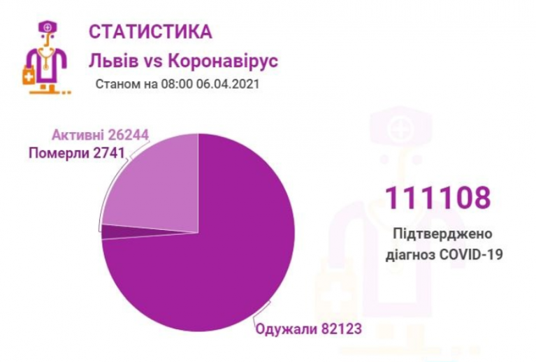 Станом на 06 квітня у Львові та Львівській області підтверджено 111108 випадків інфікування коронавірусом, з них 2741 – летальний. За минулу добу лабораторні центри провели 2336 ПЛР-тестів. Відтак, 1105 – позитивні, серед них львів`ян – 755.
