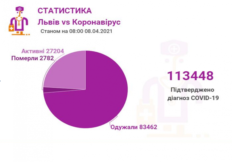 Станом на 08 квітня у Львові та Львівській області загалом коронавірусну інфекцію виявлено у 113448 осіб, 2782 людини померло. 83462 пацієнти одужало. По місту Covid-19 підтвердили у 55808 осіб, з яких 41298 вже одужало і летальних випадків – 1335.