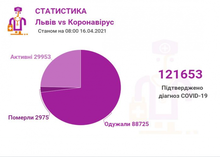 Станом на 16 квітня у Львові та Львівській області загалом коронавірусну інфекцію виявлено у 121653 осіб, 2975 людей померло. 88725 пацієнтів одужало. По місту Covid-19 підтвердили у 59994 осіб, з яких 44085 вже одужало і летальних випадків – 1441.