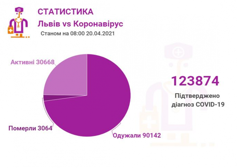 Станом на 20 квітня у Львові та Львівській області загалом коронавірусну інфекцію виявлено у 123874 осіб, 3064 людини померло. 90142 пацієнти одужало. По місту Covid-19 підтвердили у 61186 осіб, з яких 44936 вже одужало і летальних випадків – 1477.