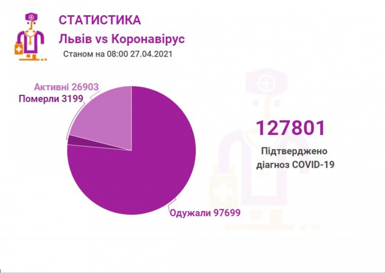 Станом на 27 квітня у Львові та Львівській області загалом коронавірусну інфекцію виявлено у 127801 особи, 3199 людей померло. 97699 пацієнти одужало. По місту Covid-19 підтвердили у 62885 осіб, з яких 47790 вже одужало і летальних випадків – 1561.