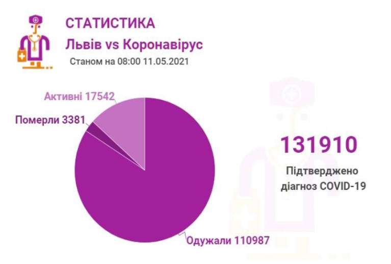 Станом на 11 травня у Львові та Львівській області підтверджено 131910 випадків інфікування коронавірусом, з яких 3381 – летальний. За минулу добу лабораторні центри провели 620 ПЛР-тестів. Відтак, 50 – позитивні, серед них львів’ян – 38.
