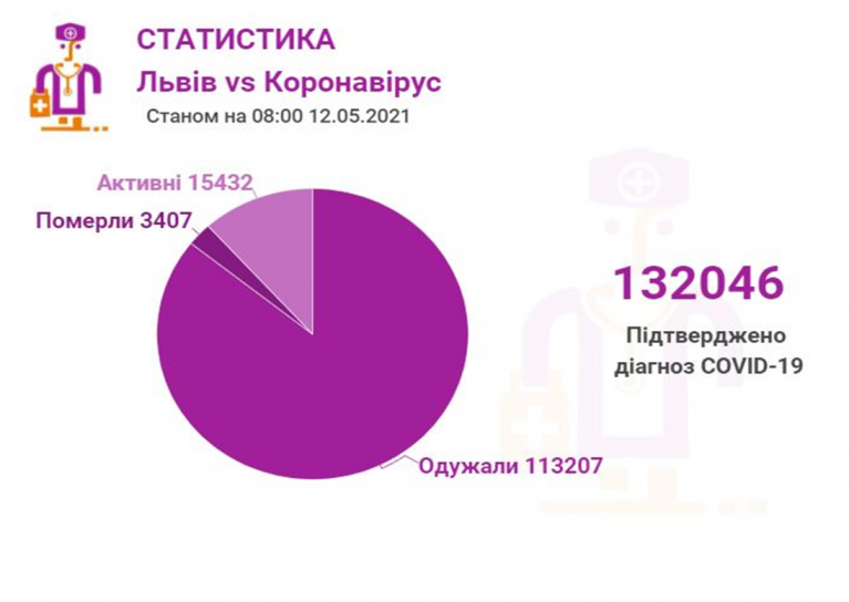 Станом на 12 травня у Львові та Львівській області загалом коронавірусну інфекцію виявлено у 132046 осіб, 3407 людей померло. 113207 пацієнтів одужало. По місту Covid-19 підтвердили у 64587 осіб, з яких 55820 вже одужало і летальних випадків – 1664.