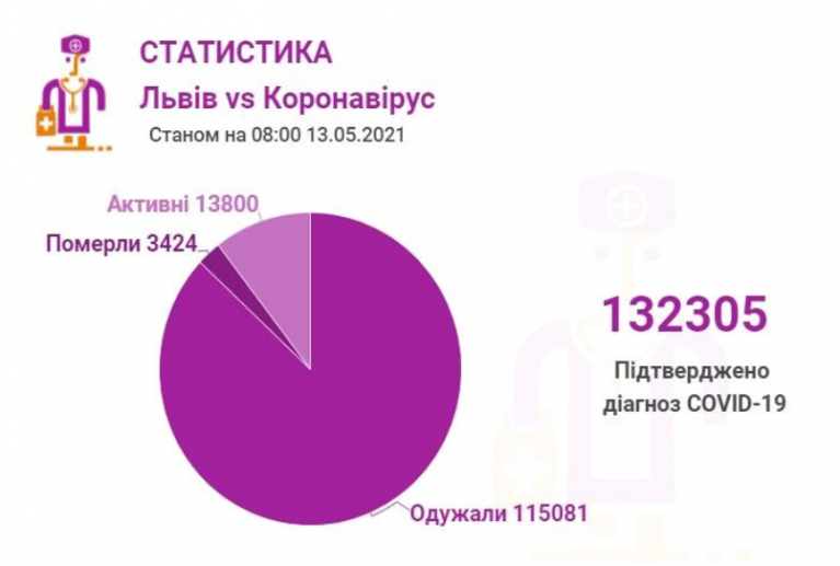 Станом на 13 травня у Львові та Львівській області підтверджено 132305 випадків інфікування коронавірусом, з яких 3424 – летальні. За минулу добу лабораторні центри провели 1392 ПЛР-тести. Відтак, 259 – позитивні, серед них львів’ян – 80.