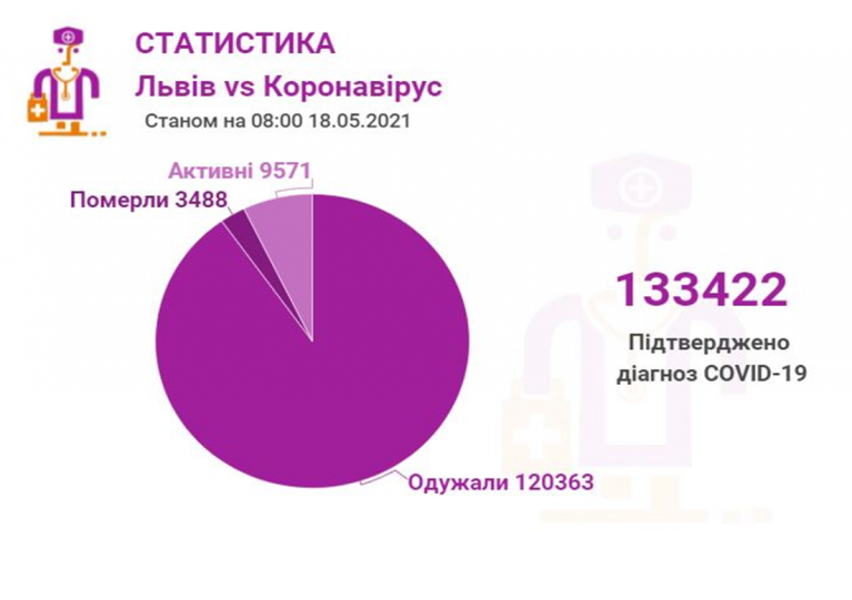 Станом на 18 травня у Львові та Львівській області загалом коронавірусну інфекцію виявлено у 133422 осіб, 3488 людей померло. 120363 пацієнти одужало. По місту Covid-19 підтвердили у 65124 осіб, з яких 58840 вже одужало і летальних випадків – 1695.