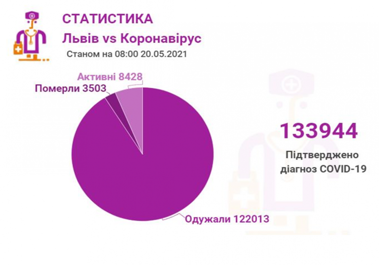 Станом на 20 травня у Львові та Львівській області загалом коронавірусну інфекцію виявлено у 133944 осіб, 3503 людини померло. 122013 пацієнтів одужало. По місту Covid-19 підтвердили у 65328 осіб, з яких 59715 вже одужало і летальних випадків – 1708.