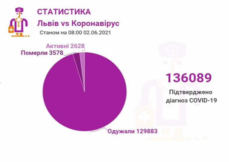 Станом на 2 червня у Львові та Львівській області загалом коронавірусну інфекцію виявлено у 136089 осіб, 3578 людей померло. 129883 пацієнти одужало. По місту Covid-19 підтвердили у 66218 осіб, з яких 63246 вже одужало і летальних випадків – 1753.