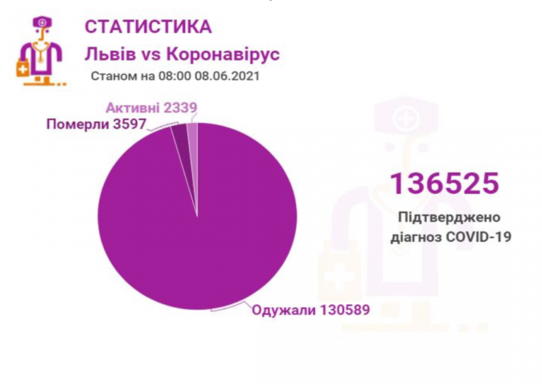 Станом на 08 червня у Львові та Львівській області коронавірусну інфекцію виявлено у 136525 осіб, 3597 людей померло. 130589 пацієнтів одужало. По місту Covid-19 підтвердили у 66395 осіб, з яких 63498 вже одужало і летальних випадків – 1759.