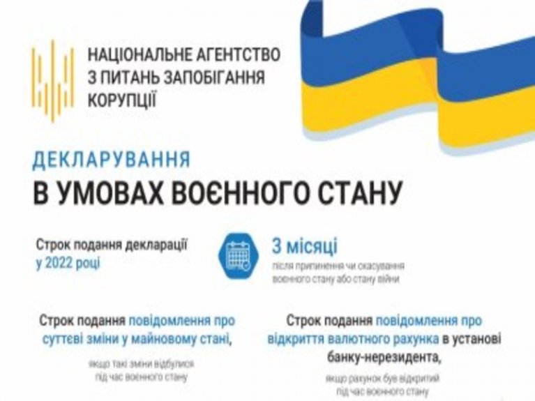 Національне агентство з питань запобігання корупції (НАЗК) у зв'язку з численними зверненнями ще раз нагадує посадовцям — під час війни можна не подавати декларації й повідомлення про суттєві зміни в майновому стані та відкриття валютного рахунку в банку-нерезиденті.