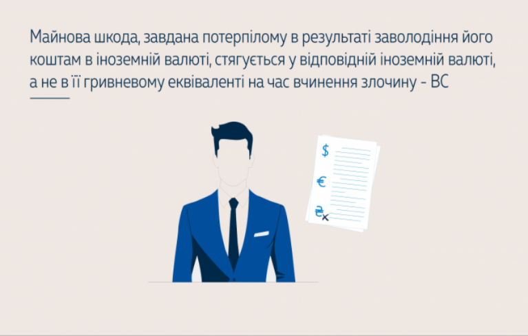 ККС ВС вважає обґрунтованими такі доводи касаційної скарги. Наведена в ухвалі апеляційного суду позиція про те, що у кримінальному провадженні підлягає відшкодуванню шкода, заподіяна кримінальним правопорушенням на час його вчинення, в гривневому еквіваленті, не ґрунтується на матеріалах провадження, положеннях цивільного процесуального законодавства та суперечить вимогам ст. 128 КПК України. Оскільки засуджений заволодів коштами потерпілих у доларах США, то ця сума має бути їм відшкодована саме у вказаній іноземній валюті, а не в її гривневому еквіваленті на час вчинення злочинів, інакше буде порушено принципи законності та справедливості в кримінальному провадженні, а вартість майна в гривневому еквіваленті на час вчинення злочину впливає лише на кваліфікацію дій засудженого залежно від розміру завданої шкоди.