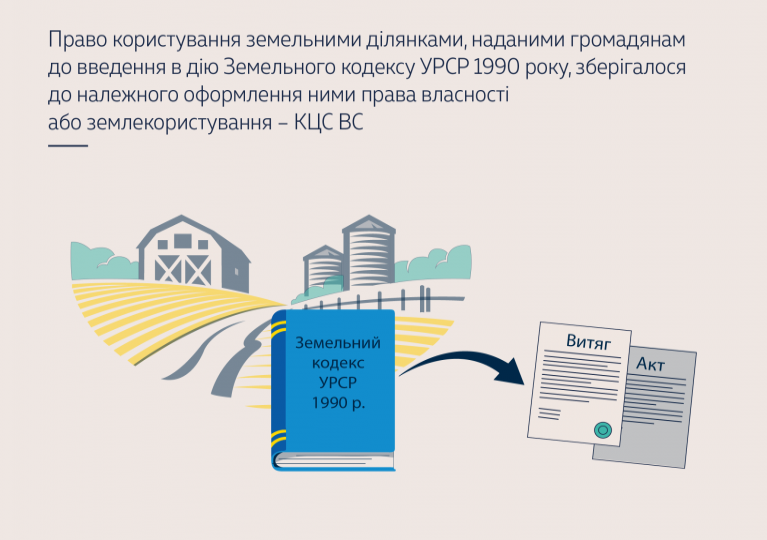 КЦС ВС погодився з висновками судів попередніх інстанцій, зазначивши, що п. 5 постанови Верховної Ради Української РСР від 18 грудня 1990 року «Про порядок введення в дію Земельного кодексу Української РСР» передбачає, що громадяни, які мають у користуванні земельні ділянки, надані їм до введення в дію цього Кодексу, зберігають свої права на користування до оформлення ними у встановленому порядку прав власності на землю або землекористування.