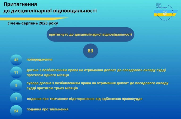 За результатами розгляду дисциплінарних справ протягом січня - серпня 2025 року Дисциплінарні палати Вищої ради правосуддя прийняли 81 рішення про притягнення до дисциплінарної відповідальності 83 суддів та застосування до них таких видів дисциплінарних стягнень: