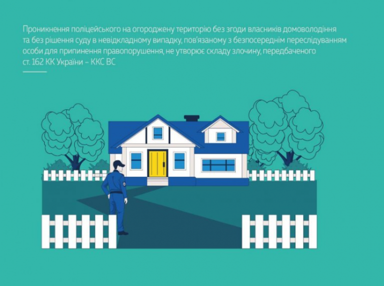Проникнення поліцейського на огороджену територію без згоди власників домоволодіння і без рішення суду в невідкладному випадку, пов’язаному з переслідуванням особи для припинення правопорушення, не утворює складу злочину, передбаченого ст. 162 КК України